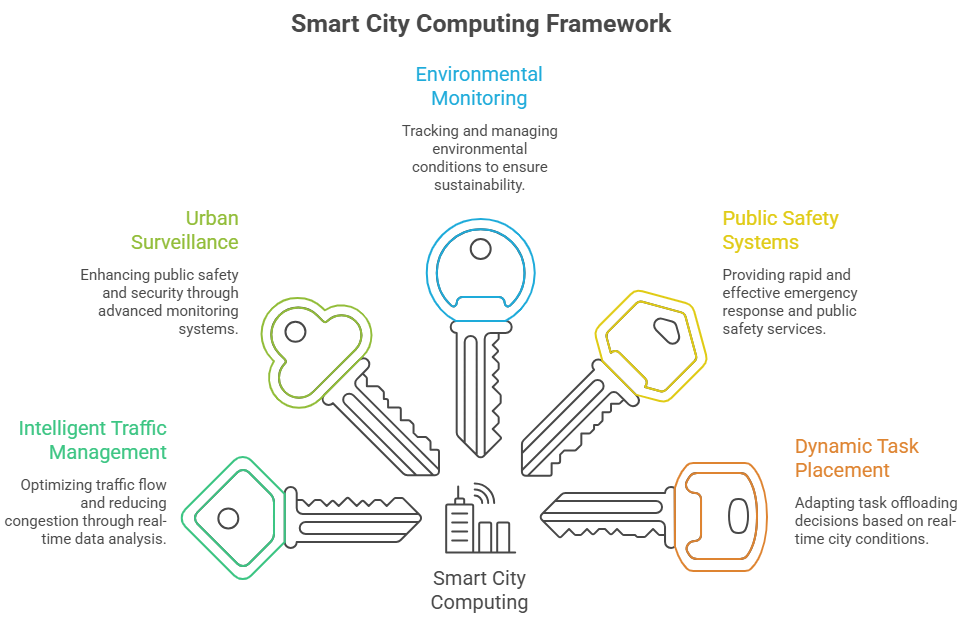 Smart city applications such as intelligent traffic management, urban surveillance, environmental monitoring, and public safety systems generate highly dynamic and location-dependent workloads that impose stringent latency and reliability requirements. Conventional cloud-centric processing models are often unable to meet these demands due to increased communication delays and fluctuating network congestion during peak urban activity.